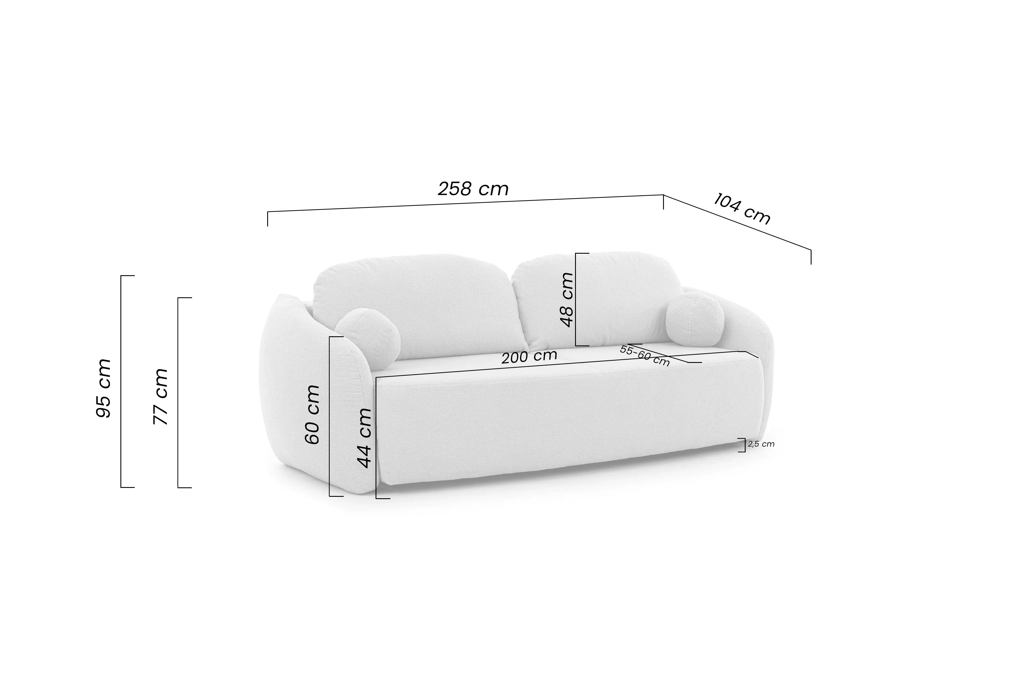 Miękka w dotyku, przytulna i niezwykle wygodna kanapa do salonu. Model Loria w modnej tkaninie bouclé (Lambi 4) łączy obłe kształty z praktycznymi rozwiązaniami – w ciągu dnia zachwyca formą, a wieczorem w kilka sekund zamienia się w komfortową sofę rozkładaną. Sofa jest mięsista i nie odkształca się.