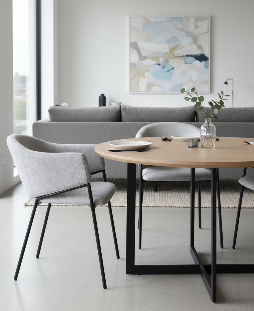Nowoczesne krzesło tapicerowane KROSS to połączenie minimalistycznego designu, wygody i funkcjonalności. Idealnie sprawdzi się w jadalni, salonie lub biurze, tworząc spójną i elegancką aranżację wnętrza. Szara tkanina o subtelnej strukturze dodaje mu uniwersalnego charakteru, który łatwo dopasować do różnych stylów wnętrz – od nowoczesnych po skandynawskie.