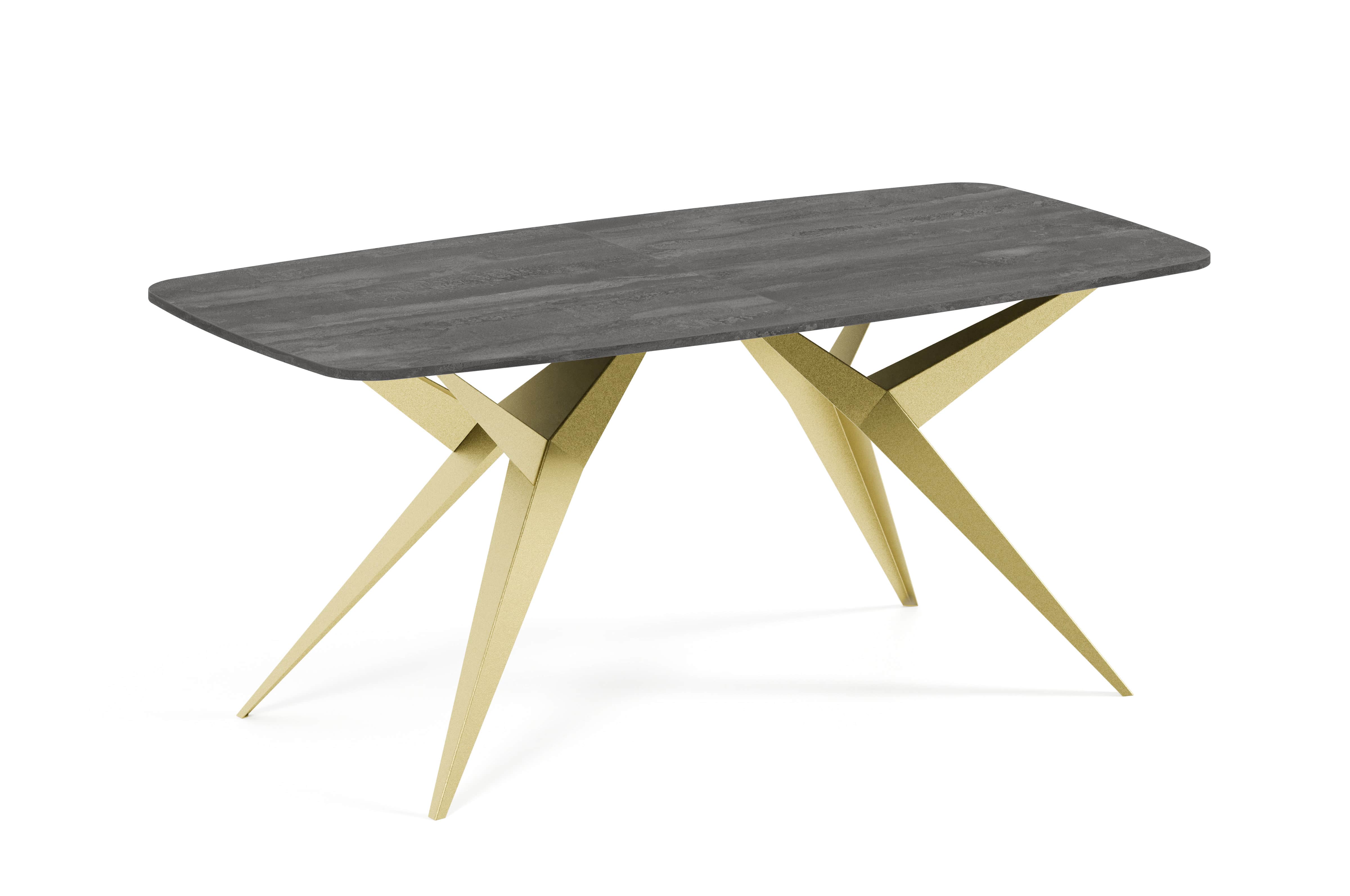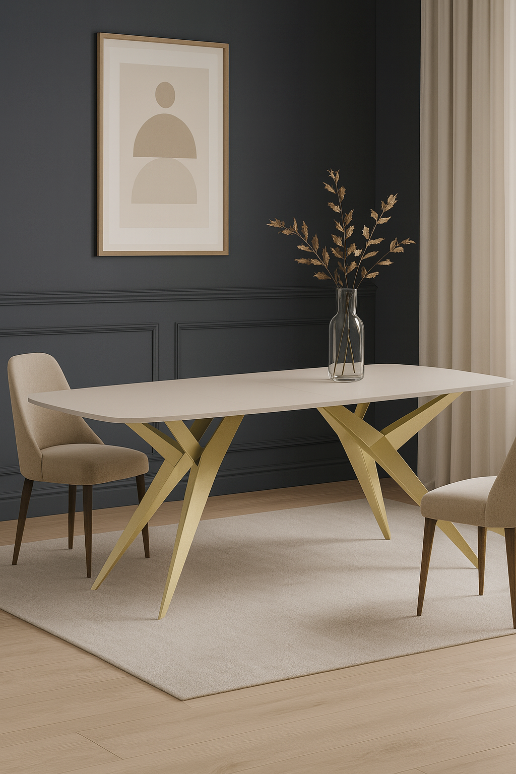 Stół owalny rozkładany AXIS 200 cm to połączenie nowoczesnego designu i elegancji w stylu glamour. Jego wyjątkowy złoty stelaż o dynamicznej, geometrycznej formie nadaje wnętrzu luksusowy charakter, a owalny blat sprawia, że mebel prezentuje się lekko i harmonijnie. To idealny stół do jadalni rozkładany, który podkreśli wyjątkowy styl zarówno klasycznych, jak i nowoczesnych aranżacji.