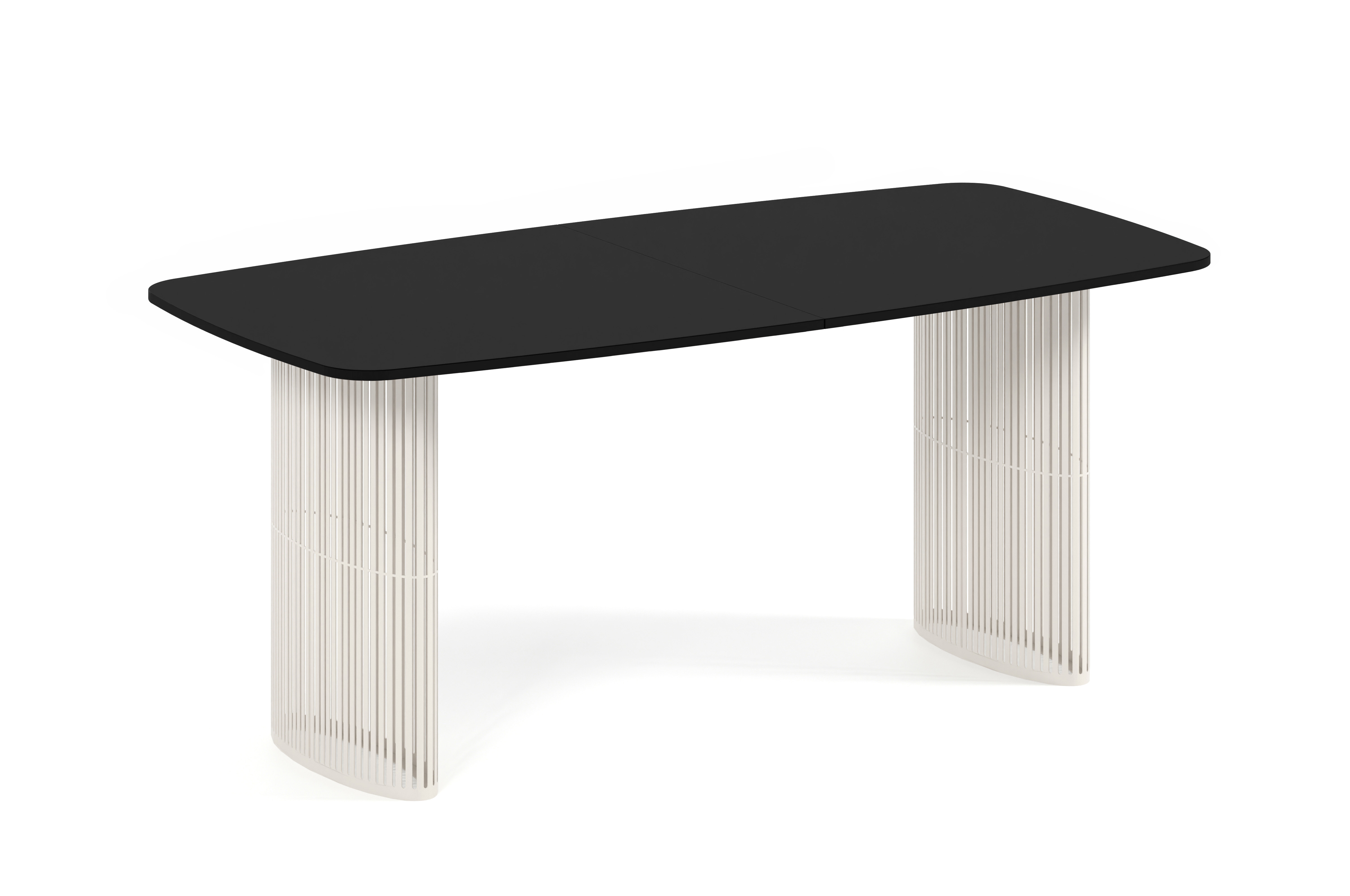 Stół wyposażony jest w stabilny stelaż wykonany z solidnej stali malowanej proszkowo w odcieniu kaszmiru. Blat wykonany z trwałej płyty laminowanej o grubości 18 mm jest odporny na uszkodzenia i łatwy w utrzymaniu. Dodatkowo istnieje opcja wykonania czarnego obrzeża, które podkreśla nowoczesny charakter mebla.